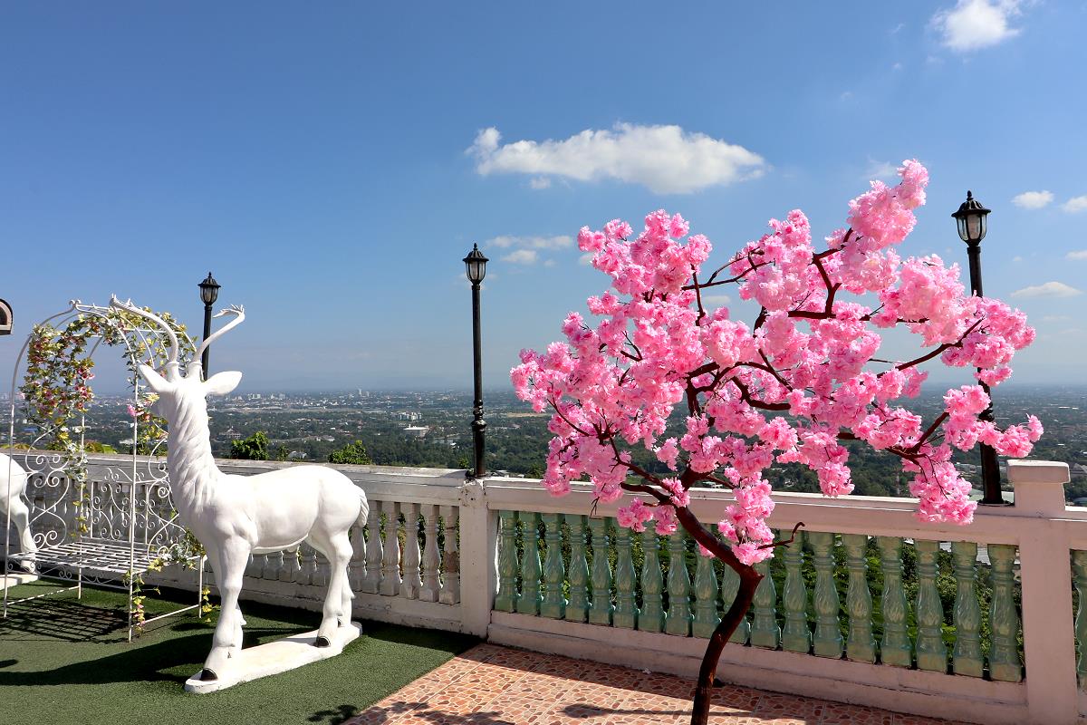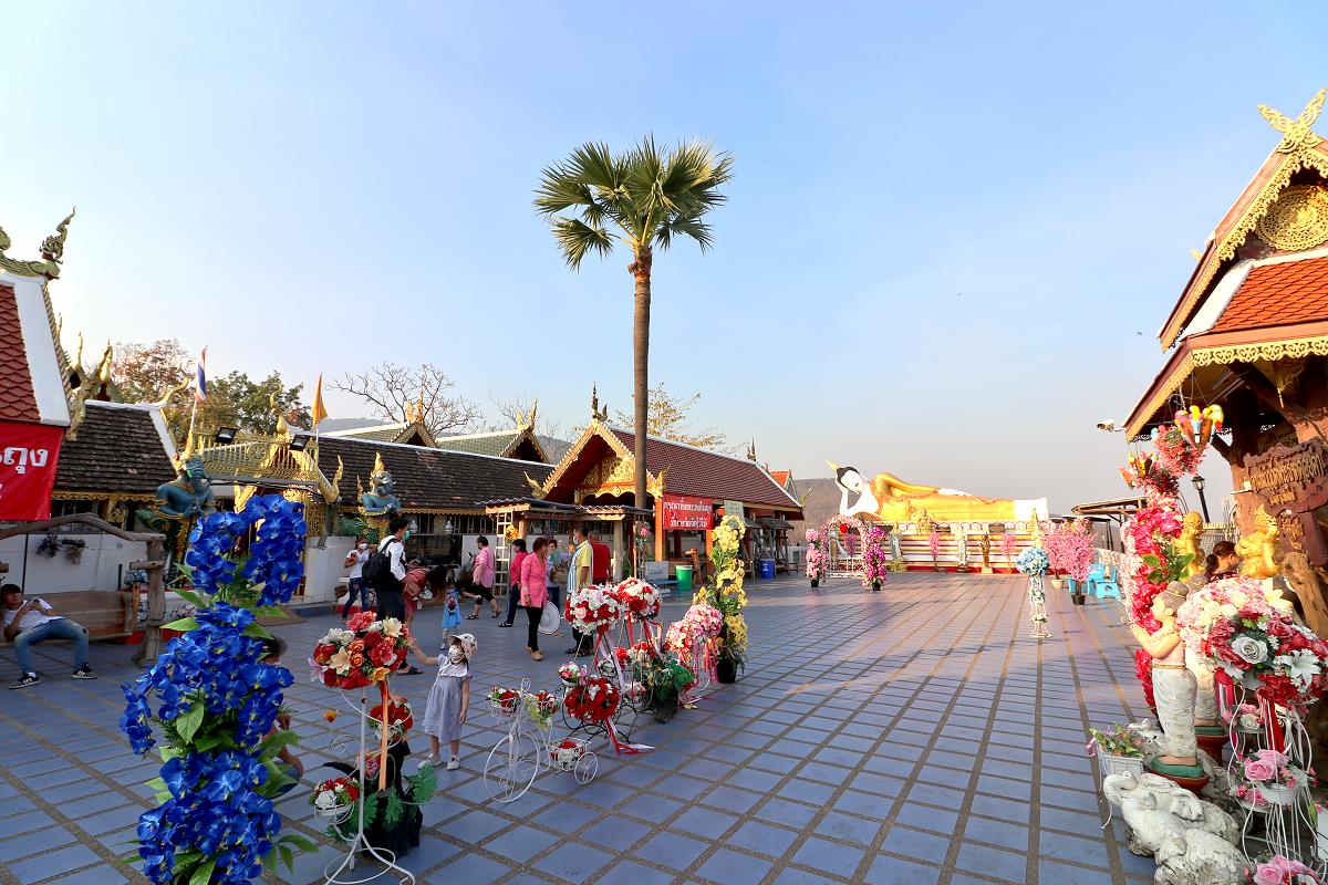 Besonders eindrucksvoll ist die Aussichtsplattform mit Blick über Chiang Mai und den Flughafen. Hier befinden sich eine weitere große sitzende Buddha-Statue, die in die Ferne blickt, sowie ein liegender Buddha.